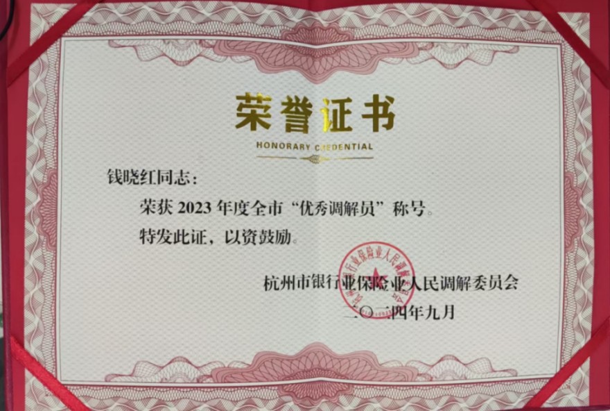 浙江分公司兼職調(diào)解員錢(qián)曉紅獲評(píng)年度“優(yōu)秀調(diào)解員”稱(chēng)號(hào)