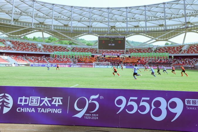在20名太平人壽員工身著“中國太平”志愿者服裝組成的旗手隊手持中國太平標志的中圈地鋪入場后,山東與江蘇兩支隊伍展開了激烈的對決。在助威團的吶喊聲中,雙方隊員都展現(xiàn)出了出色的競技狀態(tài),經過90分鐘的角逐,雙方最終以2:2握手言和,精彩的比賽贏得了現(xiàn)場觀眾的陣陣掌聲和喝彩。