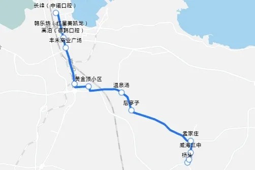 橋頭、橋頭稅務(wù)、威海三中、孟家莊、后亭子、溫泉湯、黃金頂小區(qū)、江家寨、豐禾商業(yè)廣場(chǎng)、蒿泊、韓樂(lè)坊、長(zhǎng)峰,共12站。