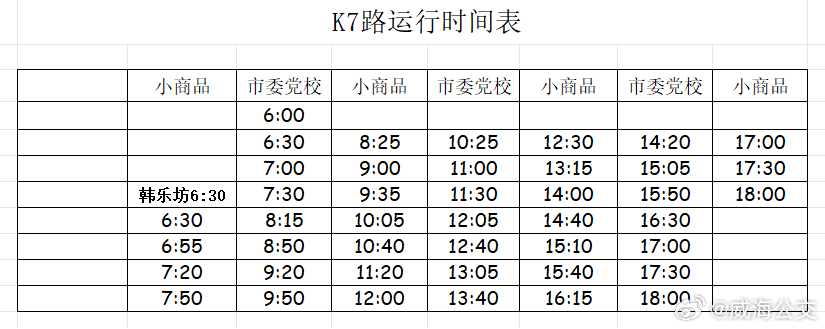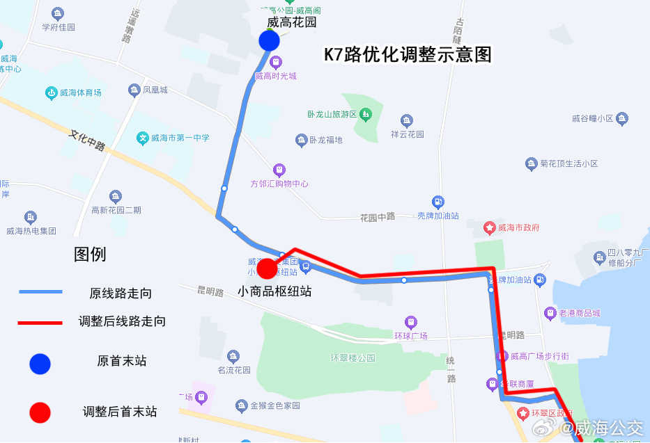 調整后,K7路由市委黨校發(fā)車,按原線路運行至小商品樞紐站,取消威高花園、神道口、市民卡環(huán)翠服務中心、小商品市場4個站點。