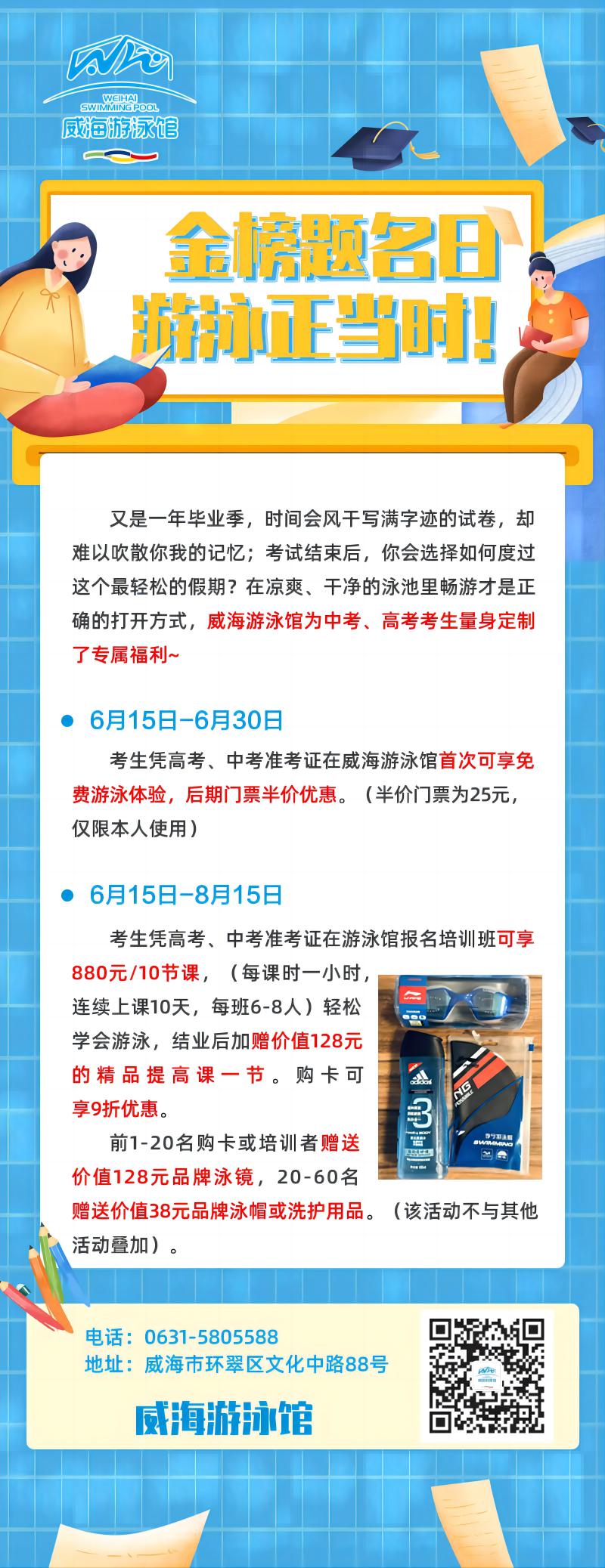 6月15日-6月30日考生憑高考、中考準(zhǔn)考證在威海游泳館首次可享免費(fèi)游泳體驗(yàn),后期門票半價優(yōu)惠。(半價門票為25元僅限本人使用)