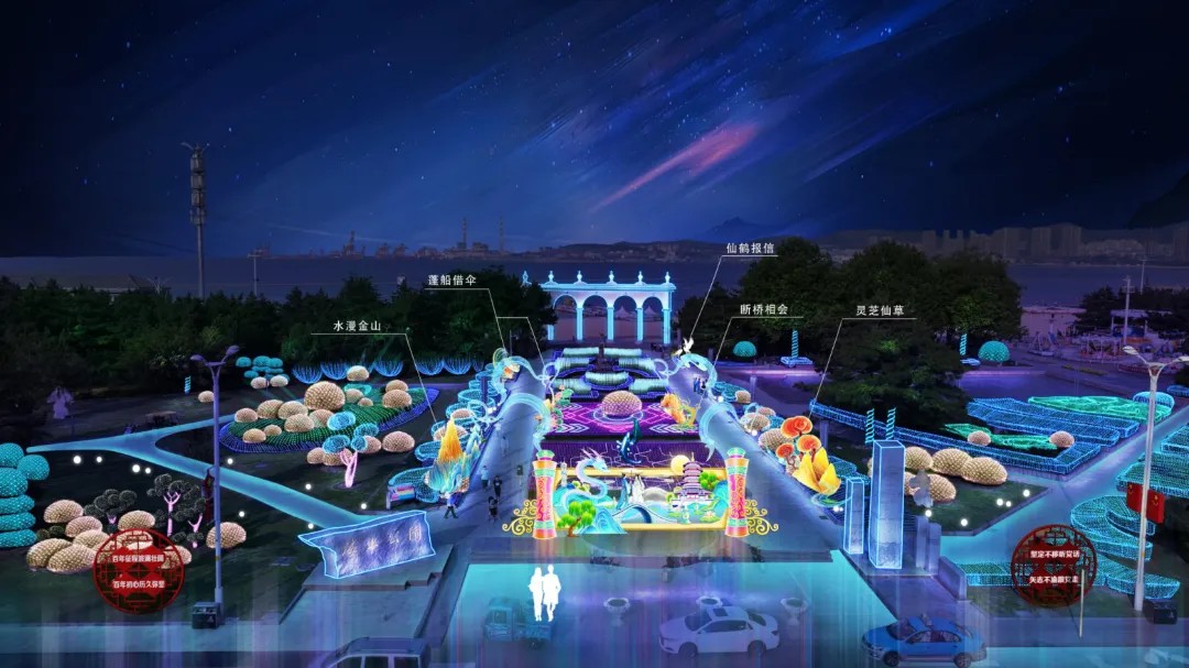 高區(qū)在高新廣場布置一組“山海畫卷”立體景觀,主體造型以卷軸為本,以海洋文化為題材,融入海洋動植物、浪花、祥云、海鷗等元素。廣場四周樹木、草坪上采取紅燈籠、水母燈、詩詞燈柱、網(wǎng)燈等燈飾和“毛衣樹”裝飾進行全方位裝點,達到晝夜皆景。同時,在世昌大道、文化路、環(huán)海路、火炬八街等重要路段和重要節(jié)點的行道樹上懸掛燈籠,綠地里布置燈飾。