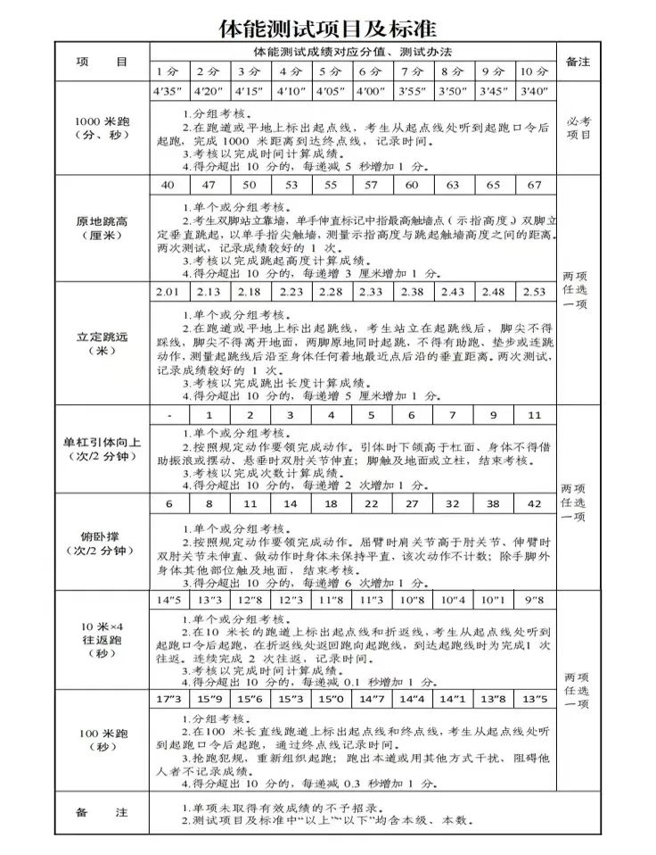 01體能、體型測試:標準參照《國家綜合性消防救援隊伍消防員招錄體能測試、崗位適應(yīng)性測試項目及標準》執(zhí)行??己隧椖繛椋?000米跑必考項;原地跳高、立定跳遠,兩項選一項;單杠引體向上、俯臥撐,兩項選一項;10米×4往返跑、100米跑兩項選一項。主要考察招收對象肌肉力量、肌肉耐力和爆發(fā)力等。
